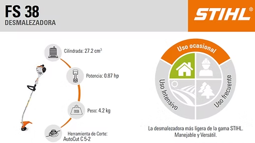 La desbrozadora gasolina Stihl FS 38 es la desbrozadora de entrada de una de las marcas más respetadas mundialmente. Stihl tiene una reputación ganada a pulso por décadas de herramientas excepcionales, y la FS 38 no es la excepción.