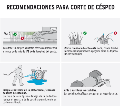 5. ¿Puedo usar esta máquina para cortar hierba en pasto mojado? Aunque técnicamente puede cortar pasto húmedo, NO lo recomiendo. El pasto mojado se pega en las cuchillas y la carcasa, reduce la efectividad del corte y puede obstruir la bolsa recolectora. Además, trabajar con pasto mojado puede ser resbaloso y peligroso. Espera siempre a que el césped esté seco.