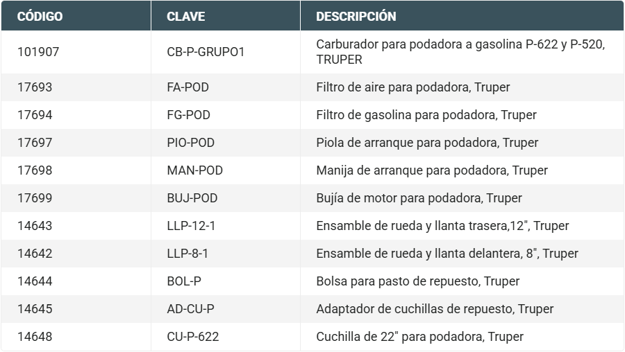 La bujía y el filtro de aire se cambian una vez al año en condiciones normales de uso. Son componentes económicos y fáciles de reemplazar. Truper tiene todas las refacciones disponibles en su catálogo (código FA-POD para el filtro de aire y BUJ-POD para la bujía), lo cual te da mucha tranquilidad.