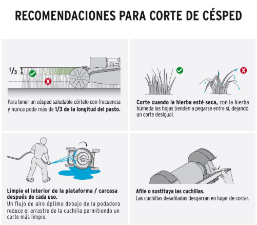 Descarga lateral: Ideal para cuando trabajas con pasto muy alto o húmedo. Permite una evacuación rápida del material cortado hacia un lado, evitando que se atasque el mecanismo.